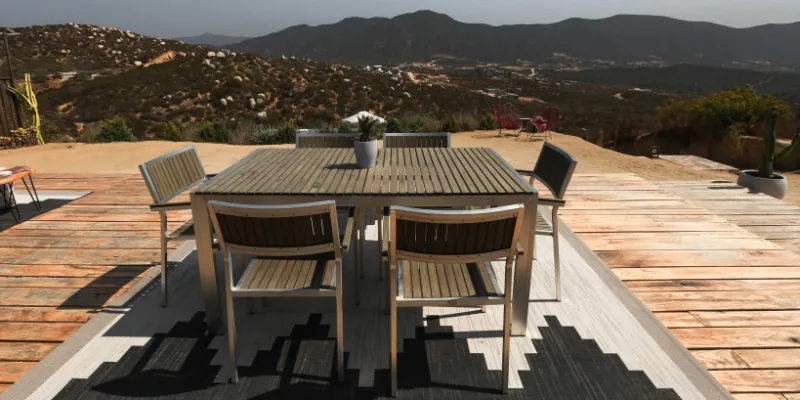 Um exemplo original seria incorporar um tapete de tear manual feito por artesãos locais em uma varanda gourmet.